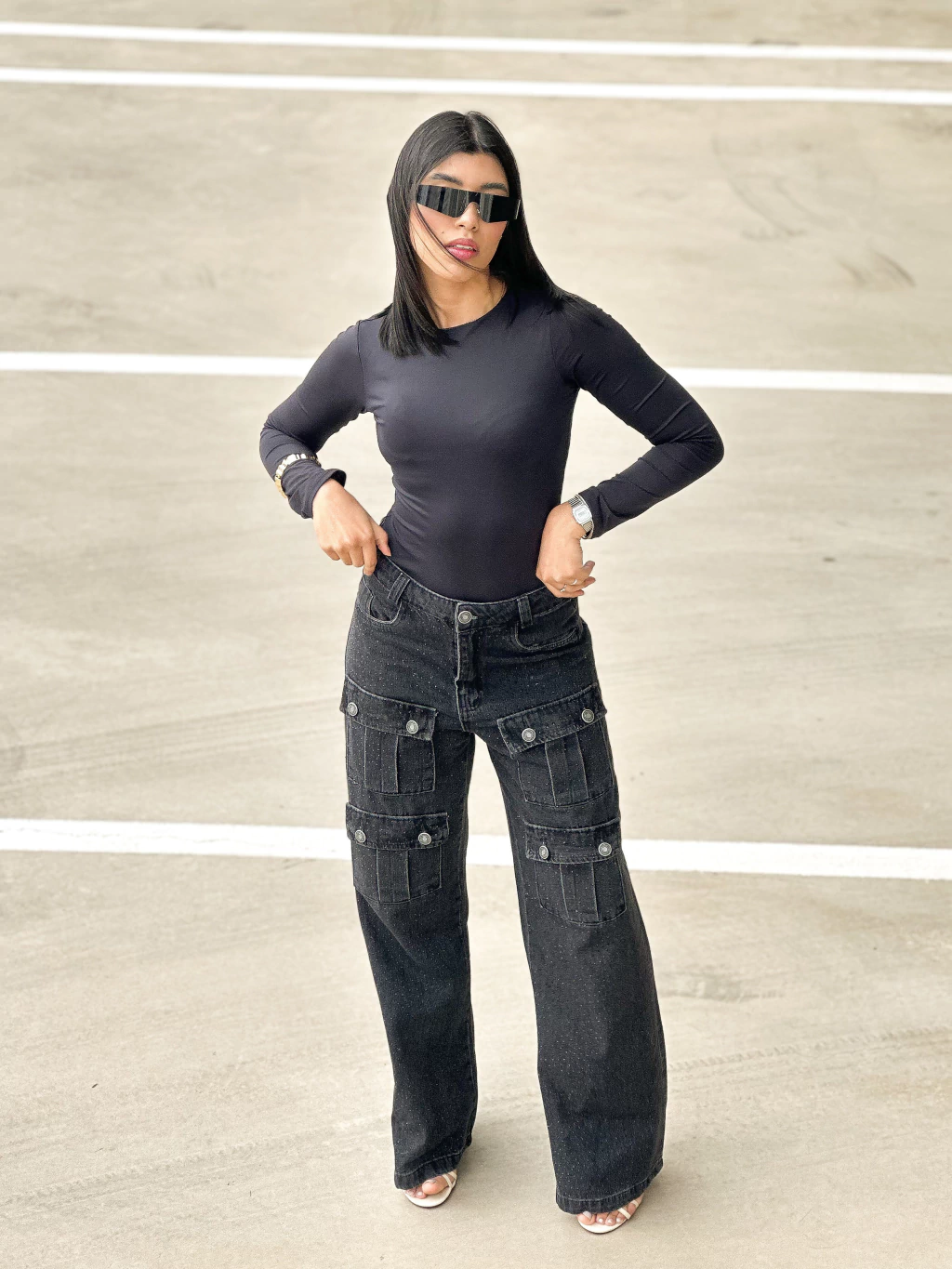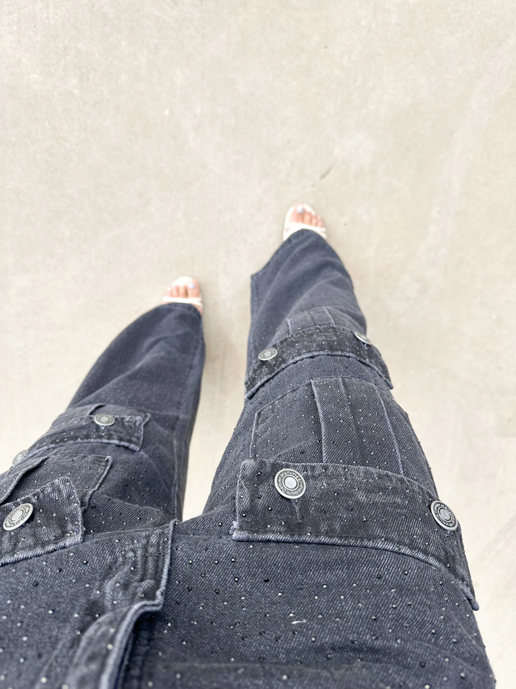 A Calça Cargo Preta com strass é a peça que está em alta e vai transformar seu guarda-roupa! Com uma cor escura elegante, essa calça une o estilo cargo clássico com o brilho sofisticado dos strass, criando um visual moderno e impactante.